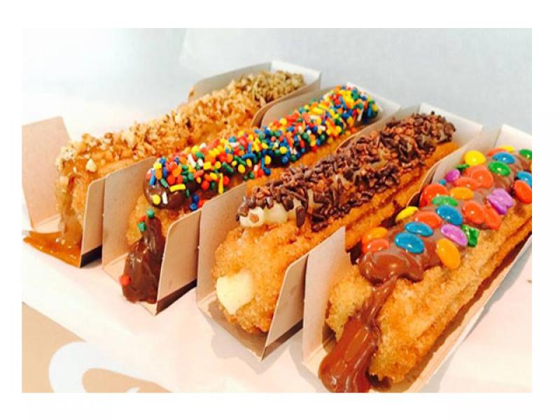 Mini churros de doce de leite ou chocolate.