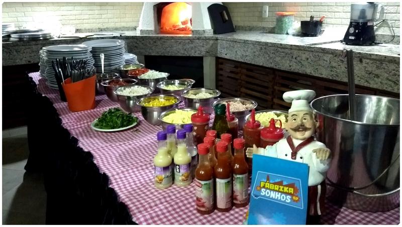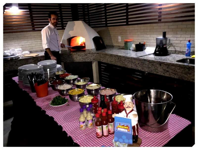 Mesa Principal com Toalha - Pratos de Porcelana - Talheres de inox - Copos de Vidro – Assadeiras - Cortador de pizza - Suporte para as pizzas - Pizzaiolo - Ajudante - Garçonete - Massas e recheios para a confecção das pizzas.
