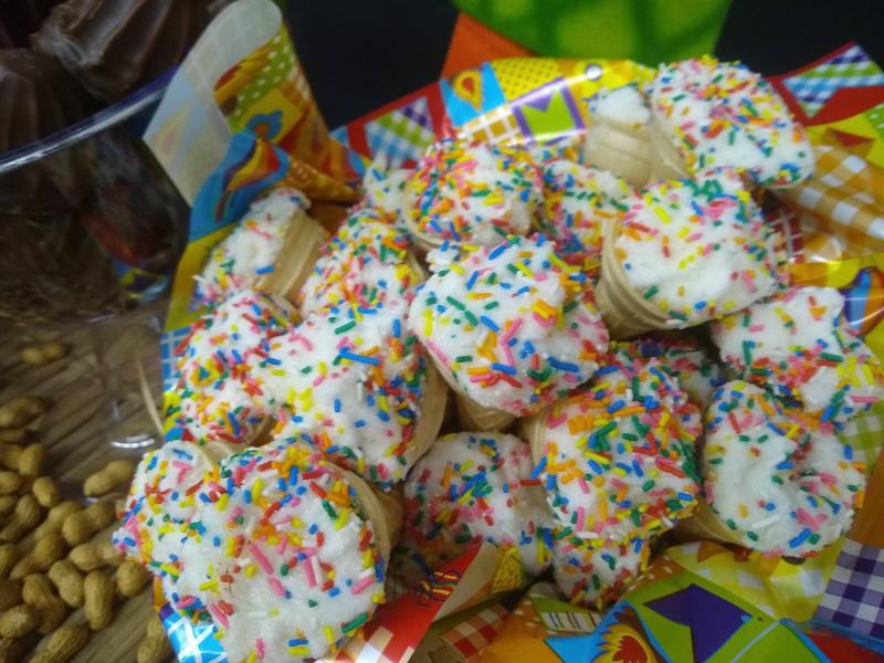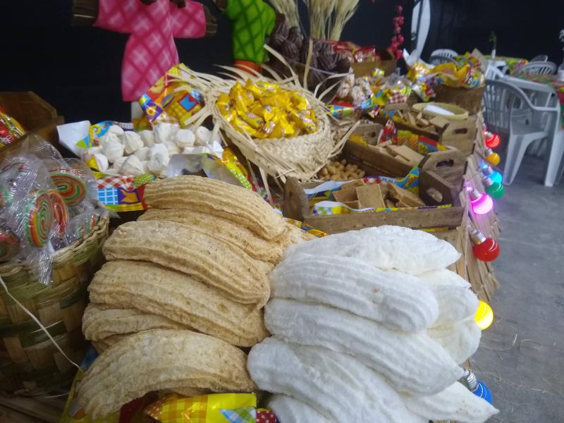 Doces tÃpicos, milho verde, pipoca, canjica, arroz doce, maçã do amor, vinho quente, quentão, Cho conhaque, cocadas, pé de moleque , bolo de Aipim c/coco, bolo de cenoura c/ calda de chocolate, bolo de Fubá, canjica, cuscuz, quindim, brigadeirão, doce de abóbora.