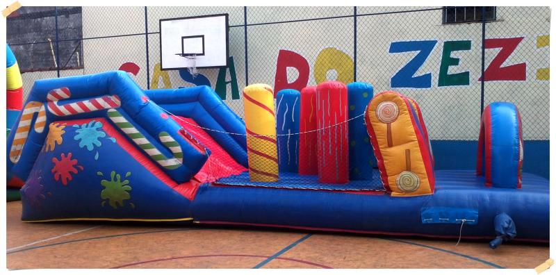 Plataforma inflável onde a criança atravessa com alguns obstáculos. Para entrar no brinquedo a criança escalar por cordas uma parede e escorrega no mini Tobogã